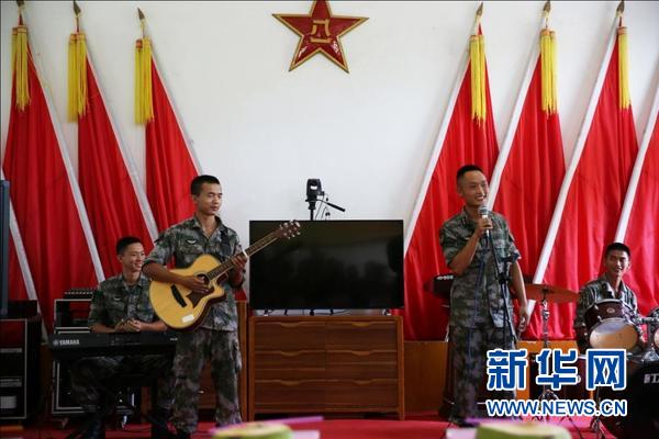 7月26日,网络媒体国防行采访团走进海南省三亚市海防旅东瑁洲模范海防连。图为海防旅东瑁洲模范海防连乐队组合演唱《北纬十八度》。新华网梁甜甜 摄