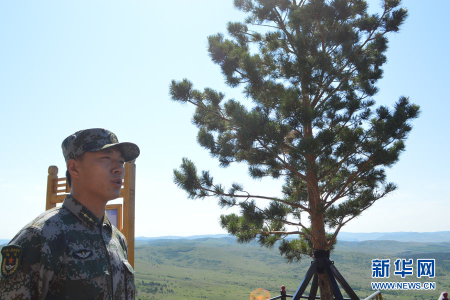 6月24日,三角山哨所,候跃敏排长在樟子松旁介绍“相思树”的故事。新华网 张敏彦 摄