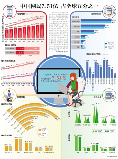 截至2017年6月,中国网民规模达到7.51亿,占全球网民总数的五分之一。昨日,中国互联网络信息中心(CNNIC)发布第40次《中国互联网络发展状况统计报告》。