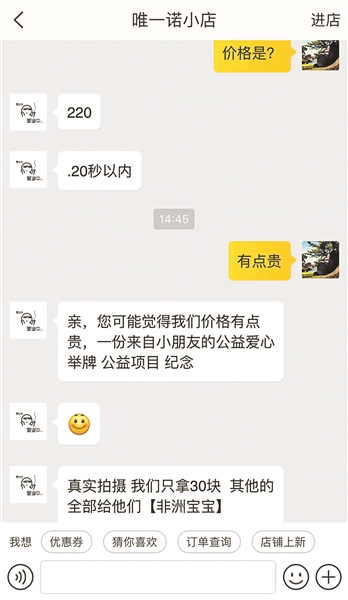北青报记者注意到,淘宝页面上的“非洲小朋友举牌”商品,单价从10元至220元不等。对此,多名商家解释,10元只是标出来的单张照片价格,如果拍摄视频,收费则从150元至220元不等。