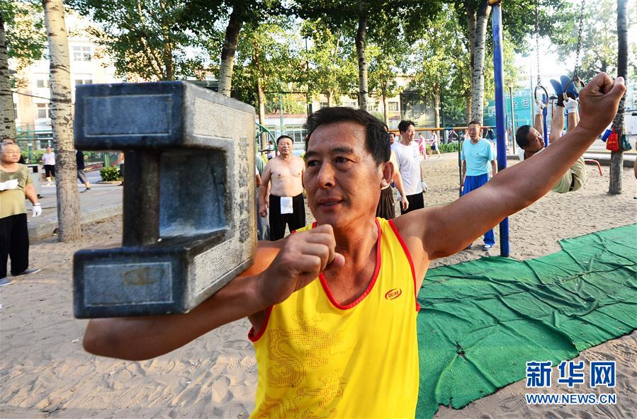 8月8日,在天津王串场公园,李建新在耍石锁健身。今年59岁的李建新身体十分健硕,每天坚持耍石锁,他的石锁用水泥做成,重达45斤,石锁在他的手中忽上忽下,从拳到肩,举重若轻。8月8日是“全民健身日”,各地有不少身怀“绝技”的健身达人,他们用自己独特的方式强身健体,乐在其中。我们展示他们的“绝技”不是供大家模仿,相反,每个人要根据自身具体情况,科学健身。