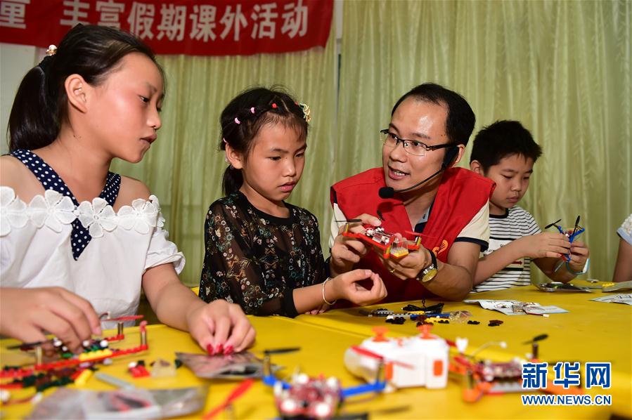 8月8日,在合肥市洪岗社区,志愿者在教留守儿童拼装玩具“无人机”。 当日,安徽省合肥市洪岗社区开设以“飞跃梦想为爱翱翔”为主题的暑期科技小课堂,邀请留守儿童与志愿者一起拼装玩具“无人机”,感受科技魅力。
