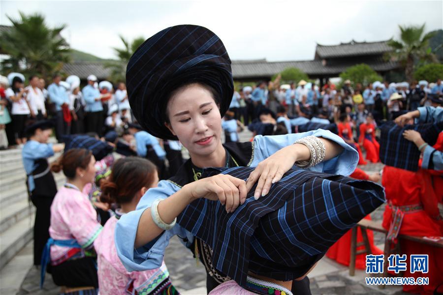 8月8日,布依妇女给新娘子包布依牛角帕。当日,来自全国各地的99对新人在贵州省贞丰县者相镇纳孔布依古寨参加布依族的传统习俗婚礼。