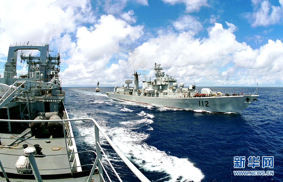 海军出访舰艇编队在太平洋赤道线上进行航行中补给(资料照片)。