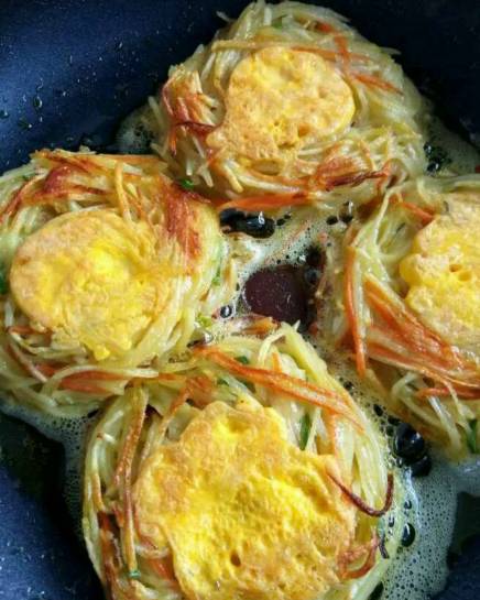 下面煎至发黄,翻面煎,土豆丝和胡萝卜丝都要煎熟。