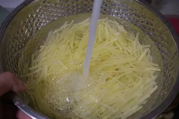 2、一定多冲洗几遍,这样去掉淀粉,土豆丝才好吃。