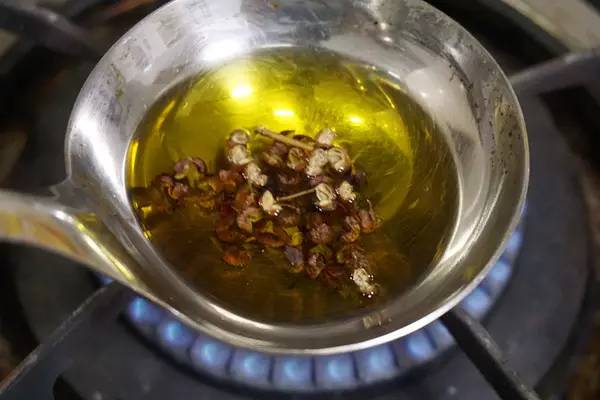 一大勺橄榄油,放入一小把花椒,火上烧热,待勺内出现密集小气泡,花椒香味逼出就关火。