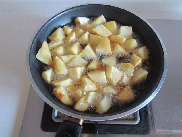 2. 炒锅中放入油,烧至六成热,放入土豆用小火煎,一直煎到外皮变得焦黄,香脆。注意尽量每一面都煎到;