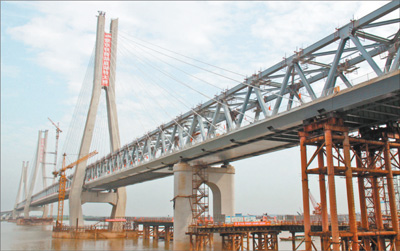 8月16日13时58分,随着最后一枚冲钉完全敲入跨中钢桁梁下弦节点板,蒙西(内蒙古浩勒报吉)至华中(江西吉安)铁路洞庭湖大桥主桥主体工程完工,标志着世界上首次在斜拉桥上采用钢箱钢桁组合结构形式、先箱后桁成桥方法。