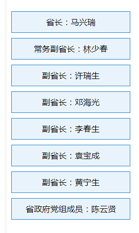 根据分工,省长马兴瑞主持省政府全面工作。负责省政府机关、编制、审计、外事、港澳事务、对台方面工作。常务副省长林少春负责发展改革、物价、民族宗教、监察、财政、税务、统计、安全生产、粮食、重点项目、法治政府建设、民政、人力资源与社会保障、食品药品监督管理、妇女儿童方面工作。副省长许瑞生负责国土资源、环境保护、核应急、城乡建设、人防方面工作。副省长邓海光负责农业、水利、林业、海洋与渔业、卫生计生、旅游、供销社、扶贫方面工作。副省长李春生兼任省公安厅厅长,负责公安、司法、海防与打私方面工作。副省长袁宝成负责工业、交通、信息化、国有资产、工商管理、质量监督方面工作。副省长黄宁生负责教育、科技、文化、新闻出版、广播影视、体育、知识产权、文史、参事、档案、地方志方面工作。