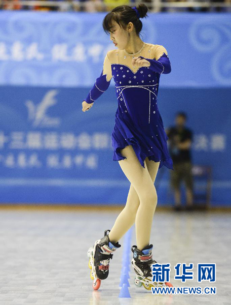 图为2017年8月12日,山东省轮滑代表队选手王鼎郁馨在南京举行的第13届全运会群众比赛轮滑项目女子花式绕桩决赛中。新华社记者季春鹏摄