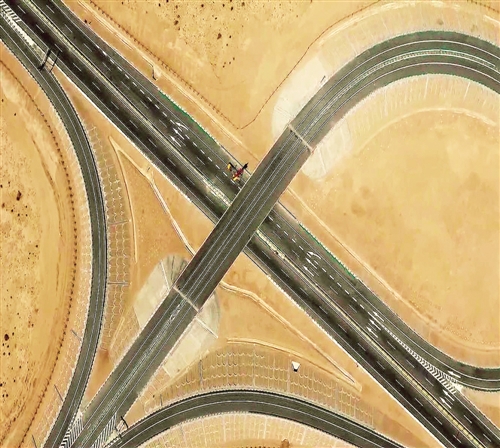 京新高速内蒙古临河至白疙瘩段建设在沙漠上的互通立交桥。该条高速路是世界上穿越沙漠、戈壁最长,亚洲最大单体交通工程,连通东北、华北、西北,全长2540公里。 史家民摄