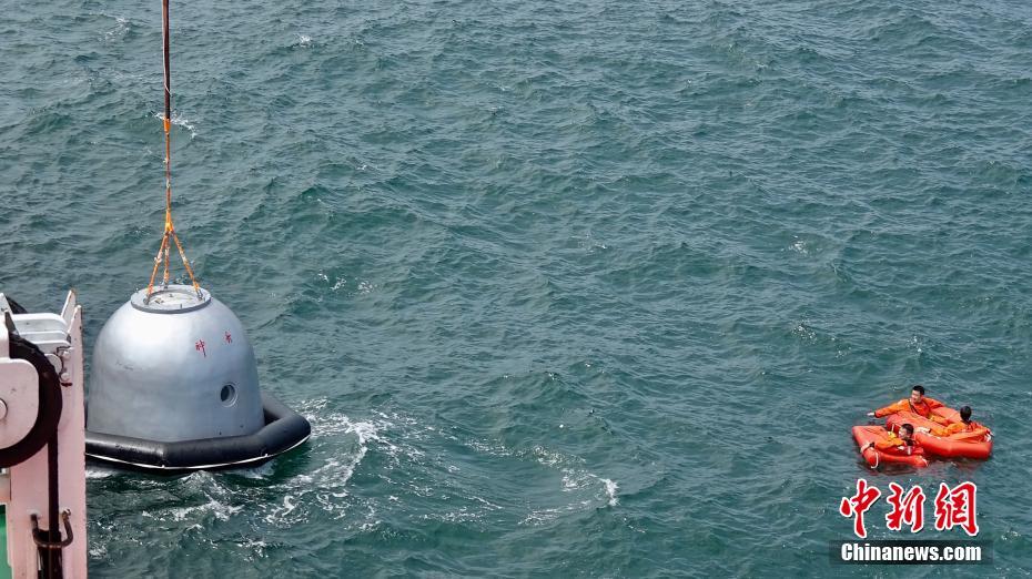 中欧航天员海上救生训练8月21日在山东省烟台市附近海域圆满完成。这次训练针对空间站载人飞行任务飞船应急返回溅落海上开展专项训练。图为三名参与训练的航天员与中国神舟飞船模拟返回舱。