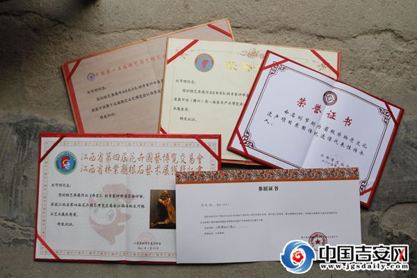 刘节明的作品斩获多项大奖,这是其中一部分证书。