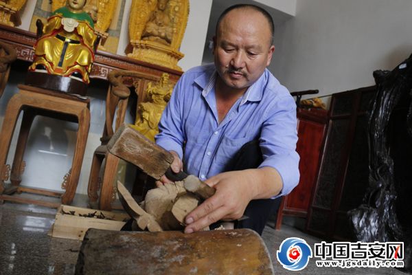 2015年东固造像被评为国家级非物质文化遗产,他成为省级代表性传承人。还担任了江西省高级根艺美术师、江西省根石艺美术学会常务理事等等。8月上旬的一个上午,在飘满木头清香的农家小院,刘节明向记者讲述了他的故事。