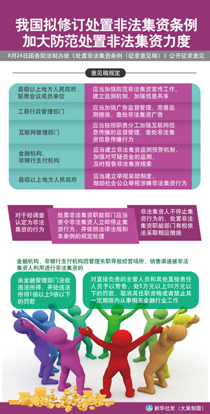 新华社北京8月24日电(记者丁小溪)国务院法制办24日就《处置非法集资条例(征求意见稿)》公开征求意见,旨在进一步防范和处置非法集资,保护社会公众合法权益,维护经济金融安全和社会秩序。