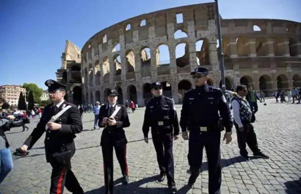 2016年5月2日,意大利罗马斗兽场外,中方警员舒健(右一)、撒一鸣(右二)与意方警员共同巡逻。