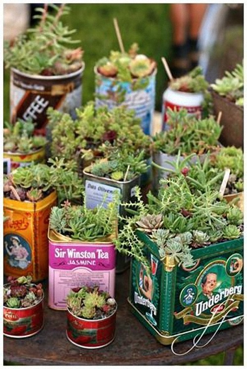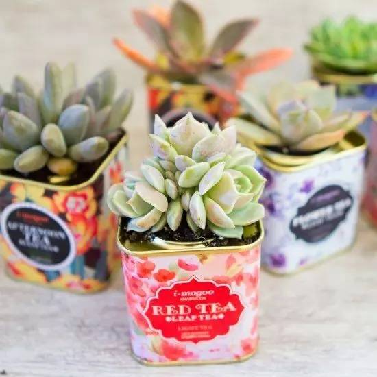 除了茶叶盒,装咖啡的铁罐、小罐头盒、甚至是啤酒罐都能用来种花养绿植,尤其是用于多肉植物移植、换盆,每到培育新肉肉的时候,就直接找来这些小盒子装上土就能用。