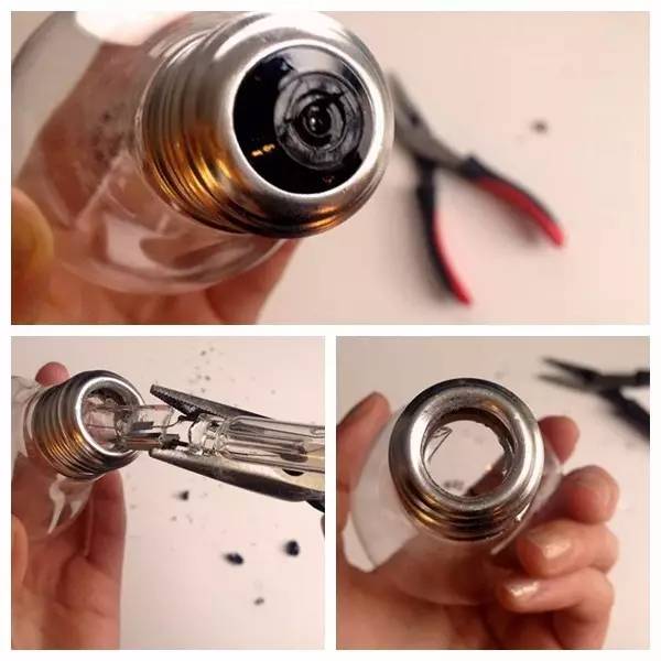 拆除时,先用钳子拧下灯泡底座的胶壳,然后将灯芯小心抽出,处理好瓶口的铁丝和碎玻璃,以免受伤。