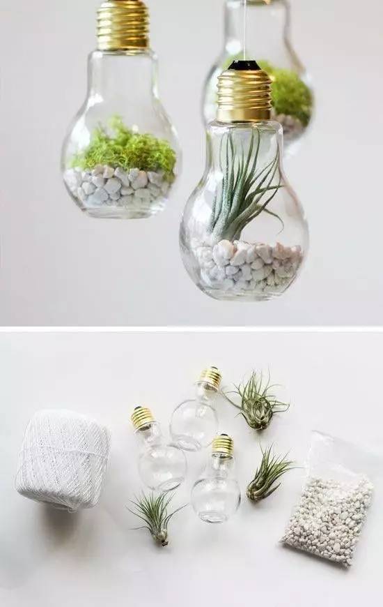 另外,旧灯泡最合适用来培育需水较少的空气凤梨和苔藓植物,只要铺上一层园艺珍珠岩,无土也能栽培。