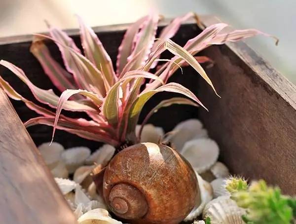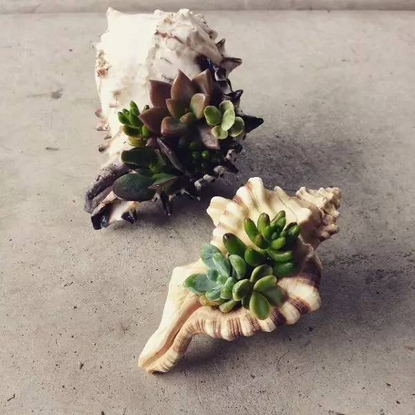 在海螺的内壳里填上一些沙土,就能养植小棵多肉,可爱的植物和造型独特的海螺搭配浑然一体,让家里都多了一丝热带海洋的风情。