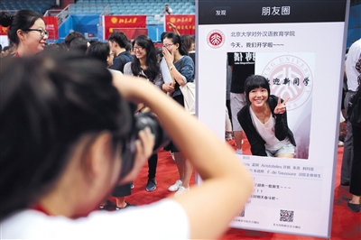 9月2日,北京大学邱德拔体育馆,来此报到的2017级新生在个性定制的相框内留影。