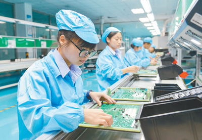 在南昌嘉捷鑫源科技有限公司厂房内,工人正在PTH线上进行插件作业。