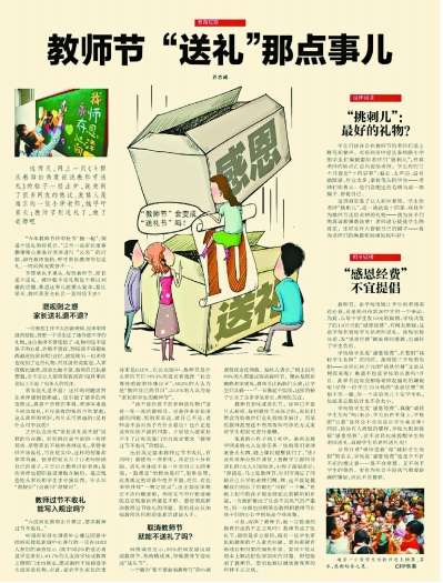 无论孩子在小学、中学还是幼儿园,几乎所有接受记者采访的家长都给老师送了礼物。由于教师节年年有,礼品年年送,家长和学生们最头疼的是:钢笔、书画、烟酒、水果等几乎都送过了,实在想不出送什么好。教师节送老师什么礼成了令家长劳神费心的事,教师节也渐渐变了味儿,有人因此提出了“取消教师节”的想法。