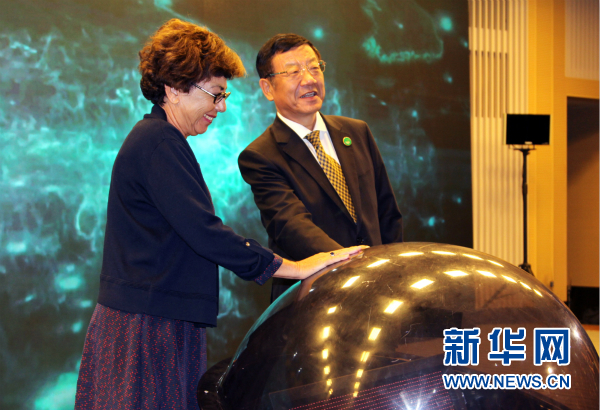 《“一带一路”防治荒漠化合作机制》启动仪式现场。中国国家林业局局长张建龙、联合国防治荒漠化公约(UNCCD)组织秘书处执行秘书莫妮卡•巴布共同按下启动球。 新华网 郭香玉 摄