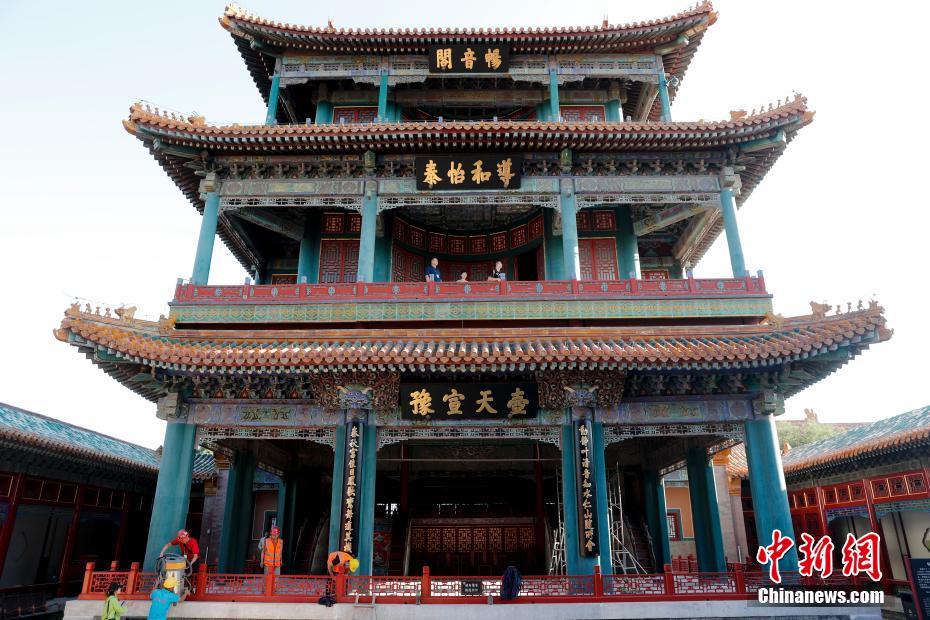 9月11日,北京故宫畅音阁戏曲馆提升改造进入尾声。9月19日起,戏曲馆将作为常设专馆亮相畅音阁、阅是楼。畅音阁戏曲馆,位于乾隆皇帝为自己养老修建的太上皇宫中,由畅音阁(戏楼)、扮戏楼(后台)和阅是楼(观众席)组成一个完整的清代宫廷“大戏院”。此次戏曲馆提升改造,着力强调宫廷戏曲的独特性,彰显畅音阁建筑的“大剧场”特色。通过新的参观流线设计,将扮戏楼纳入展览,贯通三个空间,令观众一睹剧场全貌。9月,故宫博物院的展览活动再次进入黄金期,故宫博物院将以更加丰富多元的形式向社会公众传递故宫文化信息。中新社记者 杜洋 摄
