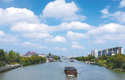 阳光强烈的夏秋午后,容易发生臭氧超标。图为蓝天白云掩映下的江南城市河畔。人民视觉