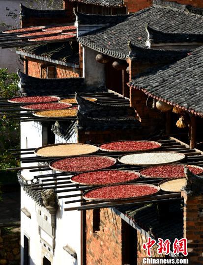 红辣椒、稻谷、玉米、菊花等农产品,摆放在徽式民居的晒架上进行晾晒,勾勒出一幅幅五彩斑斓的山村“晒秋”图。 胡敦煌 摄