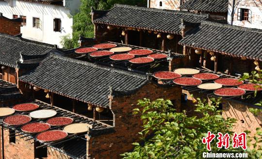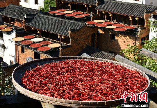 9月17日,江西省婺源县江湾镇篁岭村村民在竹匾上晾晒辣椒等农产品。 胡敦煌 摄