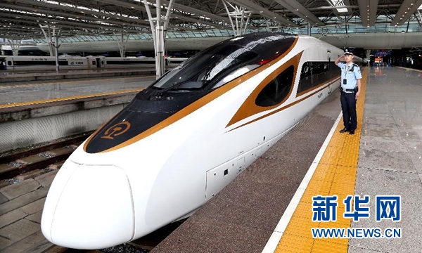 9月21日,G10次“复兴号”从上海虹桥站驶出。为确保“复兴号”运营安全,上海铁路警方在辖区高铁车站增派特警,强化巡逻防控,为所有停靠“复兴号”列车的车站,统一安排民警接送车,并选派一批素质高、责任心强、业务精湛的乘警值乘。新华社记者 凡军 摄