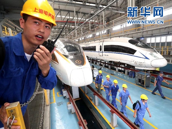 9月19日,技术保障人员进入上海虹桥“复兴号”动车检修库进行相关作业。新华社记者 陈飞 摄