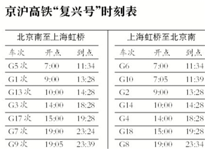 据北京南站新闻发言人梁兆玉介绍,9月21日起,北京南至上海虹桥开行7对“复兴号”中国标准动车组,按照每小时350公里运行,车次分别为:北京南至上海虹桥的G1、G3、G5、G7、G9、G13、G17次列车;上海虹桥至北京南的G2、G4、G6、G8、G10、G14、G18次列车。京沪之间全程运行压缩时间近30分钟,控制在4个半小时左右。