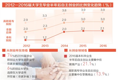 从创业存活率看,毕业半年后自主创业的2013届本科毕业生中有46.2%的人3年后还在继续自主创业,毕业半年后自主创业的2013届高职高专毕业生中有46.8%的人3年后还在继续自主创业。从创业所在地看,74%的2016届毕业即创业大学生选择留守在家乡省创业发展,这可能与毕业生创业的资源更多地来自于家庭,家乡能提供更好的创业环境有关,6%的创业大学生选择在大学读书所在省(非家乡省)创业。从资金来源看,2016届大学毕业生自主创业的资金主要依靠父母、亲友投资或借贷和个人积蓄(本科为78%,高职高专为75%),来自商业性风险投资(本科为4%,高职高专为2%)、政府资助(本科为3%,高职高专为4%)的比例均较小。从创业领域看,2016届本科毕业生半年后自主创业主要集中在教育产业(21.1%),高职高专毕业生自主创业主要集中在零售商业(13.9%)。根据对2016届毕业半年后创业人群的风险因素研究,“缺少资金”(本科为27%,高职高专为32%)是最可能导致大学生创业失败的风险因素,“缺乏企业管理经验”(本科为26%,高职高专为25%)和“市场推广困难”(本科为25%,高职高专为19%)紧随其后。