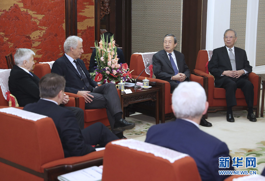 9月22日,国务院副总理马凯在北京中南海紫光阁会见法国前总理多米尼克·德维尔潘等参加首届中国-欧盟工商领袖和前高官对话的欧方代表。新华社记者马占成摄