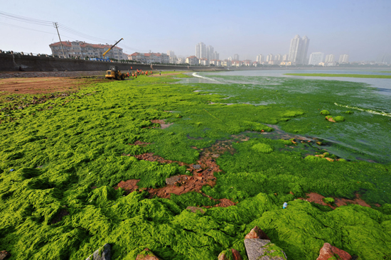 2016年6月,大片浒苔侵入山东省青岛市胶州湾入口附近,沿岸一带被“绿潮”包围