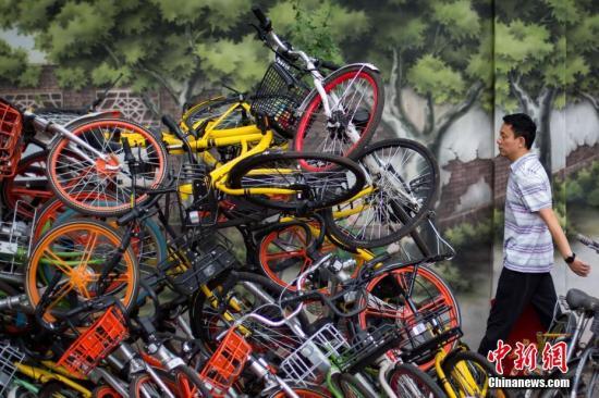 资料图:各种颜色的共享单车堆放在一起。 中新社记者 泱波 摄