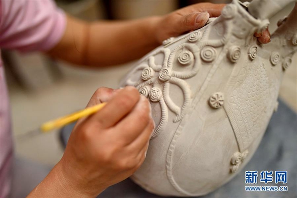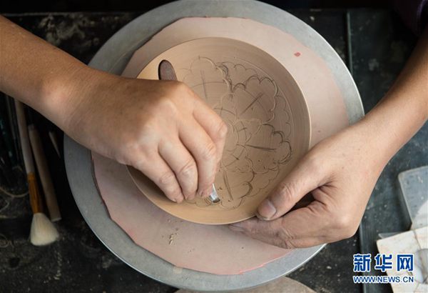 内丘县制瓷人员在邢白瓷坯体上刻花。新华社记者 牟宇 摄