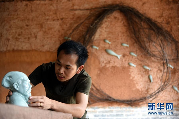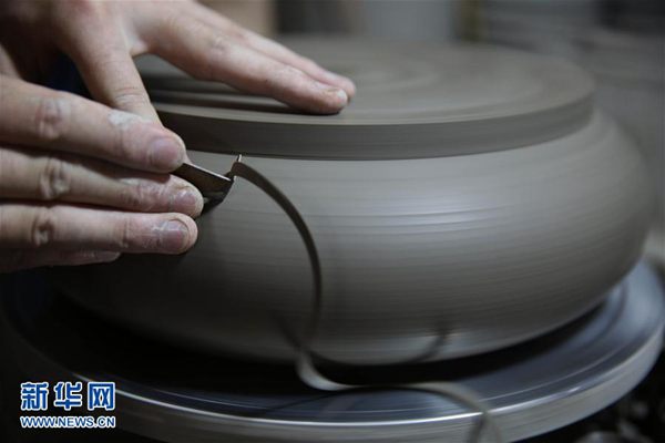 在河南省宝丰县一家汝瓷厂,汝瓷艺人在修坯。新华社发 何五昌 摄