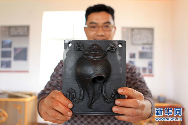 25岁的拉茸肖巴在汤堆村非遗展示区展示其制作的藏族黑陶。 新华社记者 井辉辉 摄