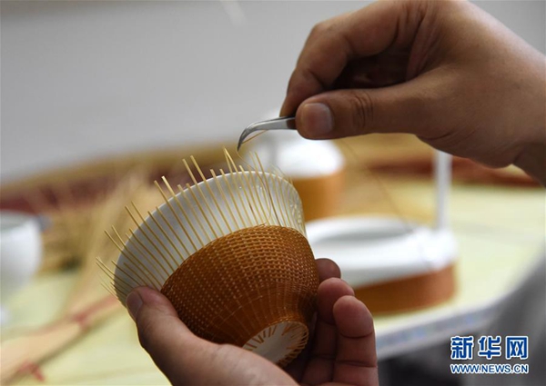 瓷胎竹编第五代传人张三石在进行瓷胎手工竹编。新华社记者 张瑞琪 摄