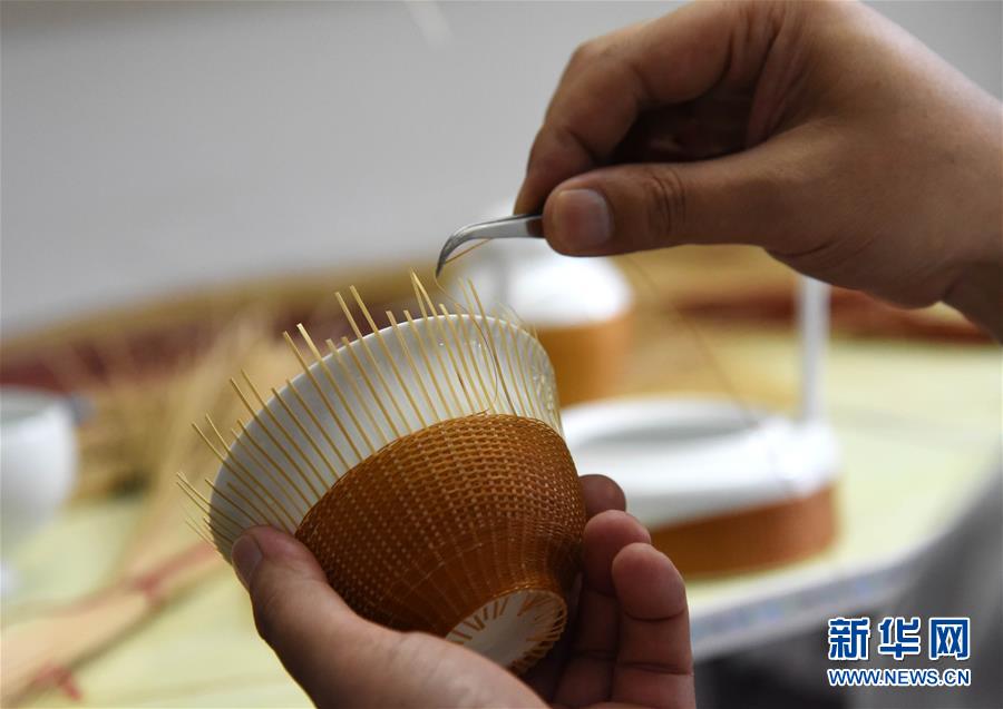 景德镇瓷胎竹编第五代传人张三石在进行瓷胎手工竹编(2017年6月26日摄)。 新华社记者 张瑞琪 摄