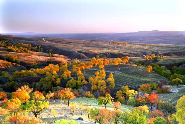 漫山遍野的色彩让人陶醉,低矮丘陵地带的西口古道上,点缀着树树黄叶,逆光下,山坡披满了黄金甲。