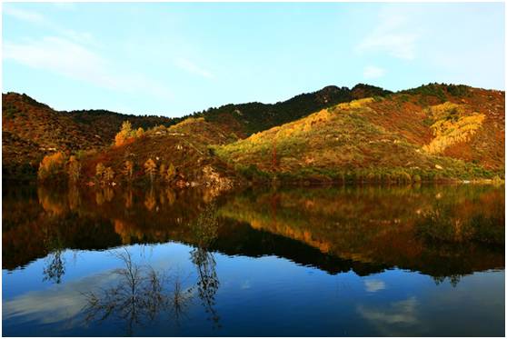 金秋的绵山是红叶染出,只有神工才能锻造出这般醉人的景色。蓝天下,碧水间,红叶点缀,一望无垠。