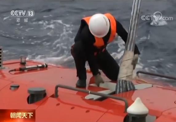经过了一番磨练,潜器终于下水并很快潜到50米,一切顺利。但是在回收的时候,却出现了惊险的一幕。潜器回收的第一步,是由蛙人将缆绳挂在潜器上面,年轻的人第一次挂缆。竟然失败了,一个浪拍过来,差点将他打入水中。