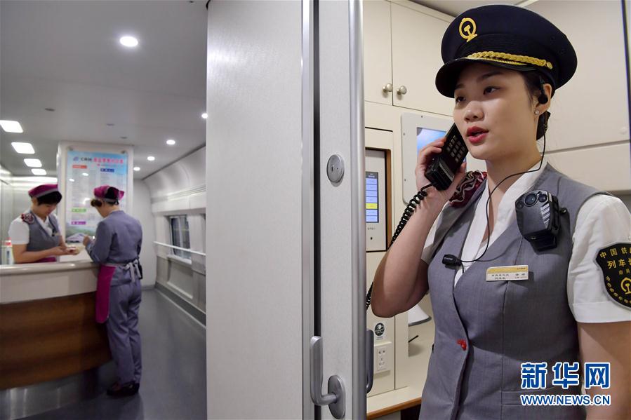 10月4日,在南昌火车站,列车长徐婷测试车上的广播系统,做出发前的准备工作。 新华社记者 彭昭之 摄