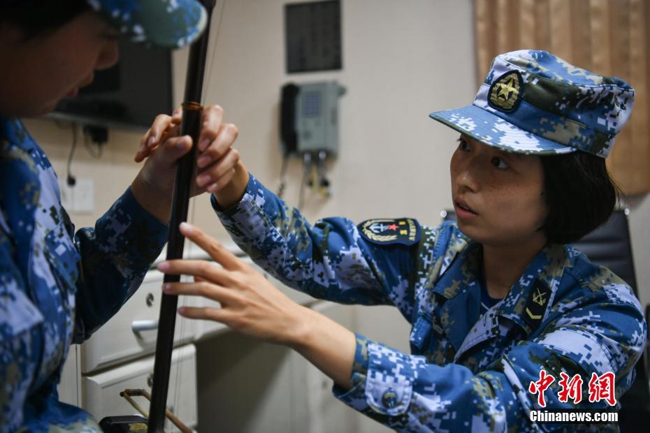 9月30日,贾男教其他女兵拉二胡。自9月13日出海以来,中俄“海上联合-2017”第二阶段军演的中国海军东平湖舰已经在海上航行了近20天,有6名女兵随舰出行,她们与其他男兵一起执行多项任务,轮流在信号、雷达、操舵等不同岗位值守。在工作训练之余,她们会聚在宿舍里读书交流,拉二胡是女兵们生活中不可缺少的“调味剂”。据了解,以前中国海军出海舰艇上是没有女兵的,自2008年开始有了第一批女舰员,到现在已经可以在中国海军许多舰艇上看见女兵风采。 中新社记者 任东 摄